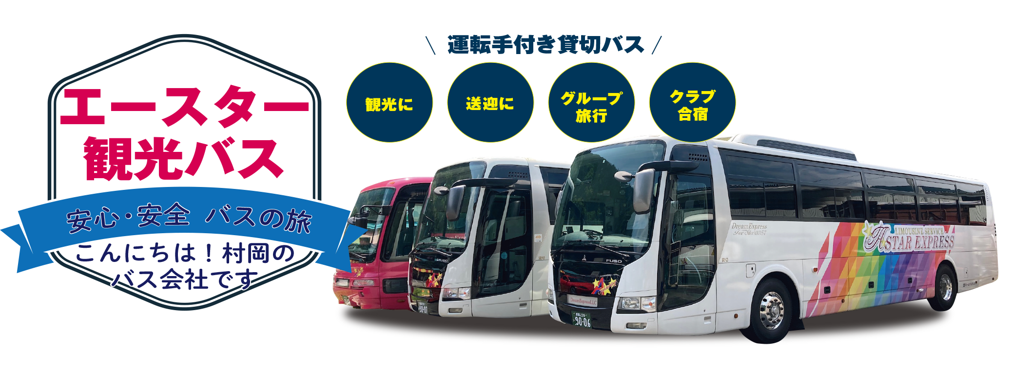 - エースター観光バスでは大型(60人乗り・55人乗り)中型(27人乗り・サロン可)小型(観光ハイデッカー・車いすリフト付)と多彩な車両で用途に合わせた車両をご用意します。